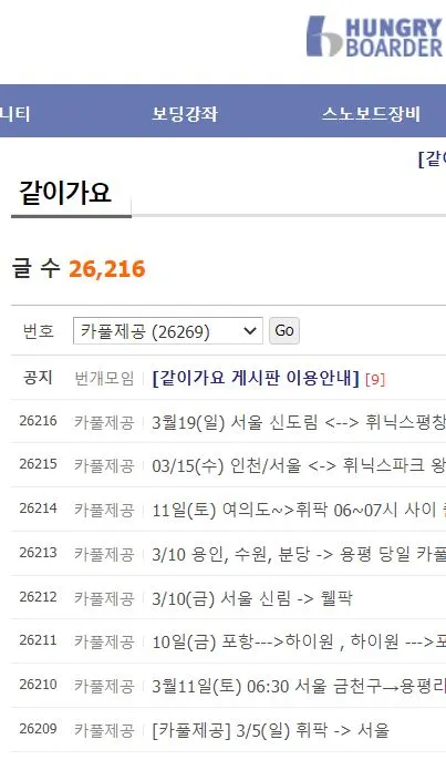 만약 차가 없어 대중교통을 이용해야 한다면 대중교통보단 카풀을 이용하는 쪽을 추천드립니다. 아무래도 휘닉스 파크는 스노보더 비율이 높기에 크고 작은 오픈카톡이나 동호회가 많아 거기에 카풀을 구하면 수월하게 이동할 수 있습니다.
